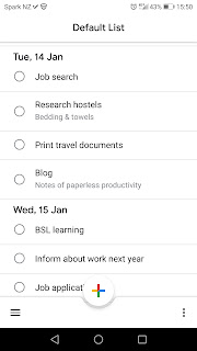 The first month of the year is almost up and this is the first month of me trying out some paperless productivity. For ease I decided to start by using the software that is connected to the calendar I already use, and that is Google Tasks and Google Keep Notes. The simplicity of both these apps probably also meant that they were a good place to start. (In this post I'm just going to keep referring to my to-dos as tasks - it just seems to make sense here).